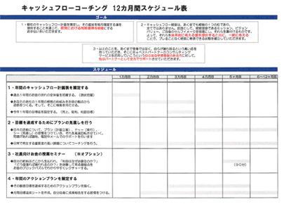 お金の流れ=キャッシュフローをもう少し正確に理解して頂くために、「キャッシュフロー計画表」を作成して、キャッシュフロー・コーチングを一定の期間行います。